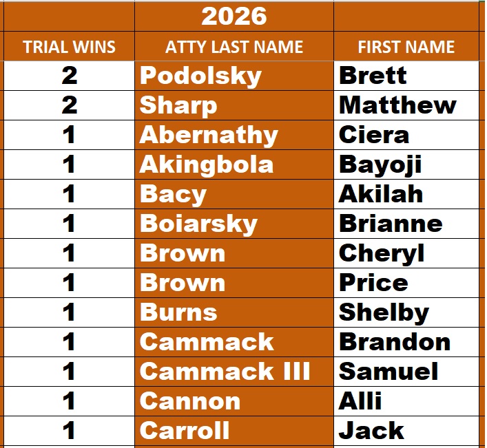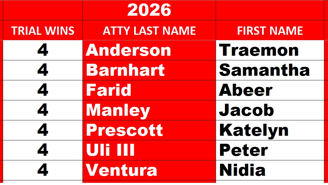 Congratulations to the trial winners and to the 26 Lawyers below who won their case with a dismissal of charges!