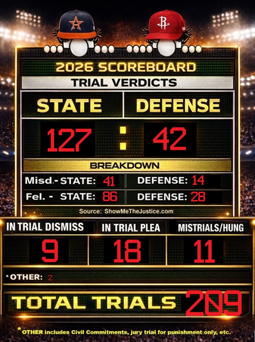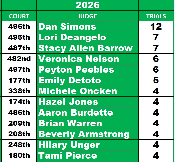 We had 35 lawyers complete 21 trials this week at the Harris County Criminal Courthouse. The results – 11 Guilty Verdicts, 2 Not Guilty Verdicts, 3 In-Trial Dismissals, 2 In-Trial Pleas and 3 Hung Juries/Mistrials.