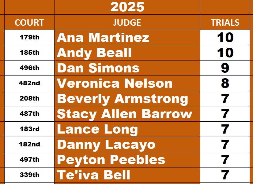 We had 22 lawyers complete 11 trials this week at the Harris County Criminal Courthouse. The results – 7 Guilty Verdicts, 2 Not Guilty Verdicts, 1 In-Trial Dismissal, 1 In-Trial Plea and 1 Hung Jury.