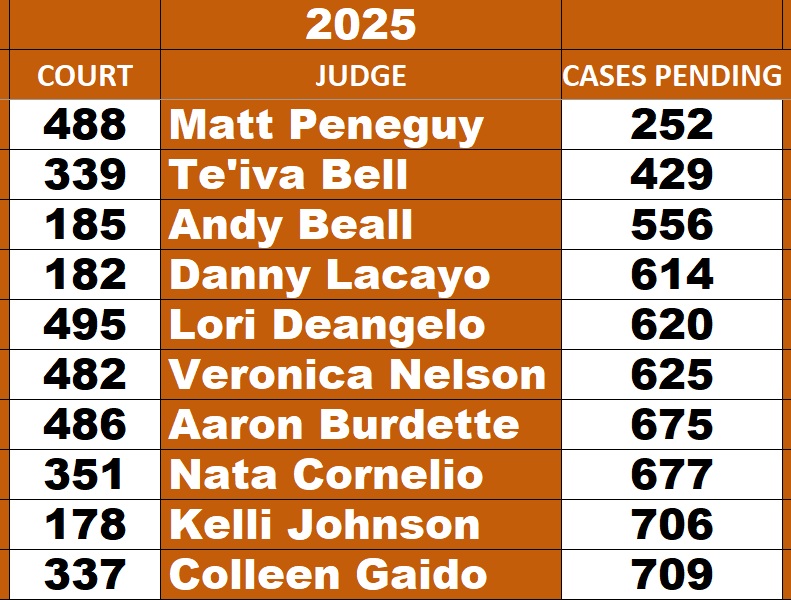 Top 10 Misdemeanor Courts for LOWEST docket totals June 2025 – source: Harris County Courts Active Cases Report