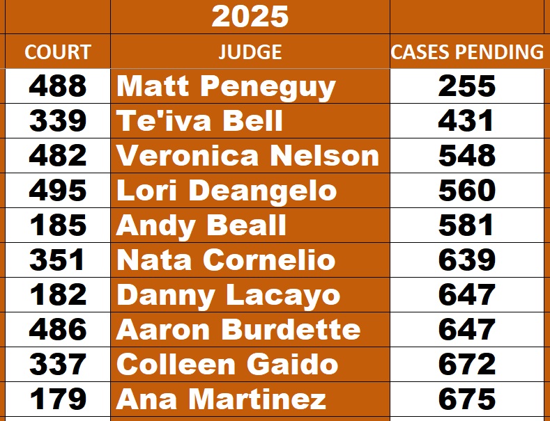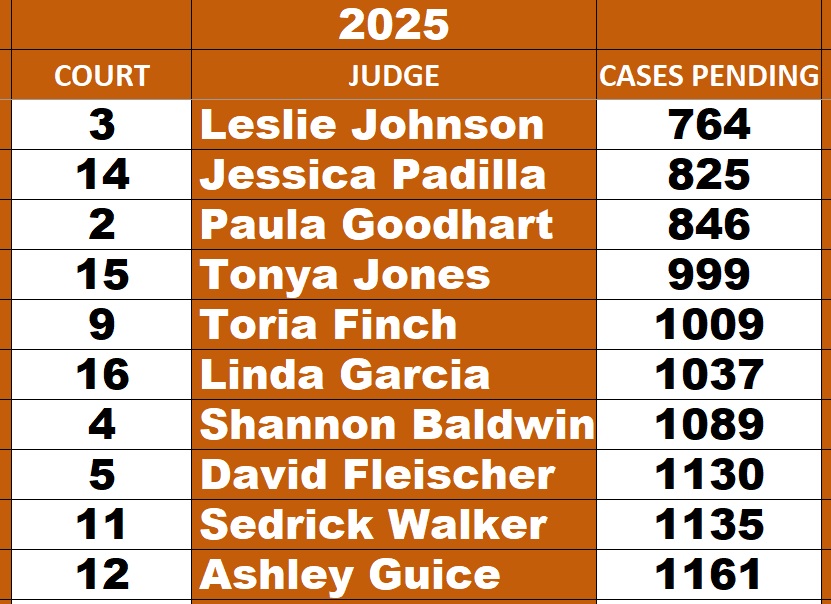 Top 10 Misdemeanor Courts for LOWEST docket totals July 2025 – source: Harris County Courts Active Cases Report