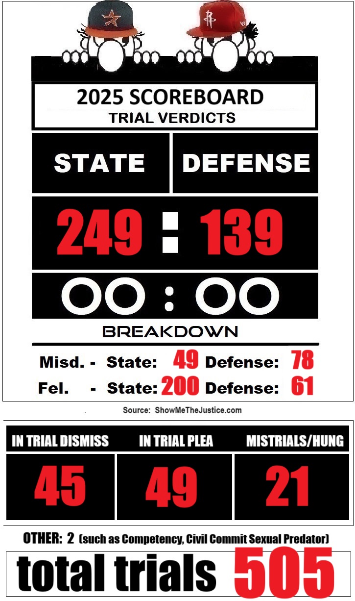 Note: This scoreboard may not be 100% accurate as I could have missed some mistrials that occurred at the early stages of the trial or a quick court trial that lasted a couple of hours….. but it is close to 100%.